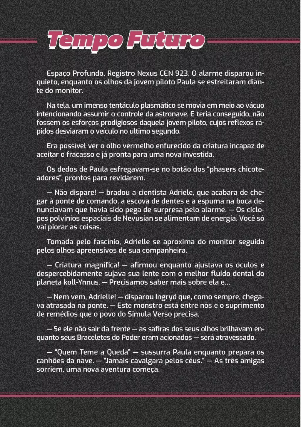 Regras para inventar seus títulos (Tipos, Tramas e Trecos) e poderes. Inclui seis temas de personagens pré-moldados: aventureiro científico, campeão da justiça, comando tático, estranho, poderoso e sombrio.